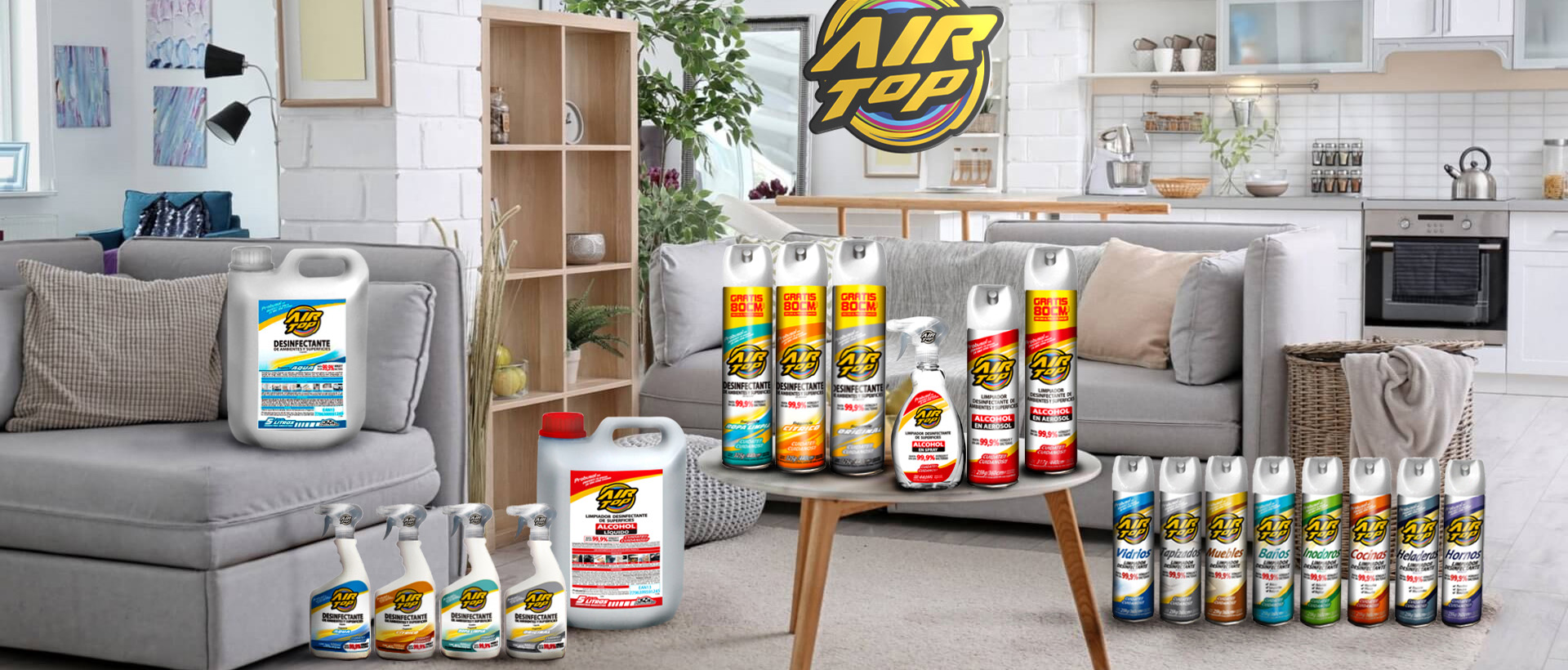 Línea Air Top Desinfectantes de ambientes y superficies. Desinfecta y sanitiza dejando una agradable fragancia. Convierte tu hogar en una zona segura eliminando el 99.9% de Bacterias y Hongos. Productos aprobados por ANMAT.