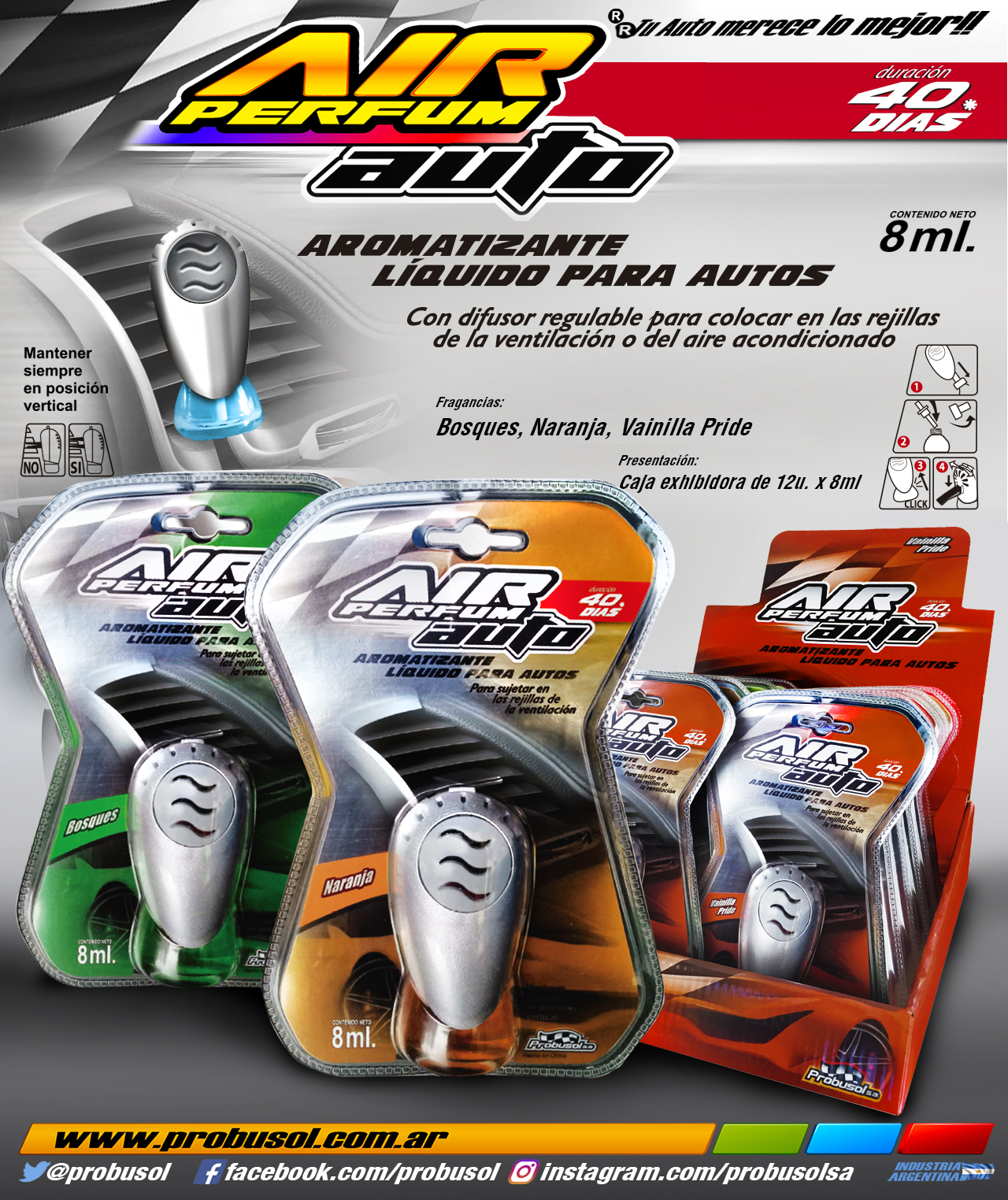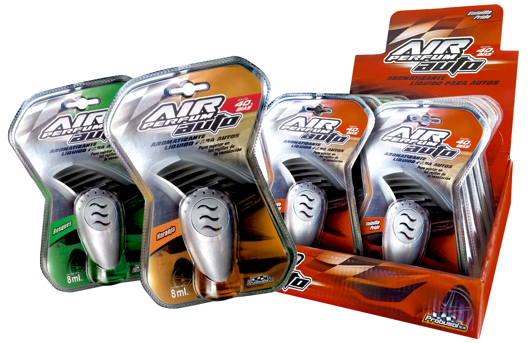 Aromatizante regulable con toques metalizados, perfume líquido para autos. Con dosificador regulable para colocar en las rejillas de ventilación del interior del automóvil. 40 días de duración