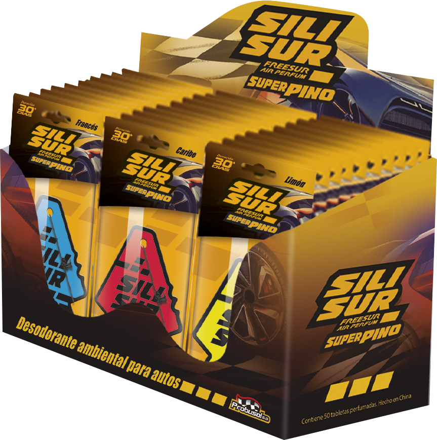 Desodorante ambiental para autos son la perfecta combinación de fragancia y color. De acción continua, estos pinos mantienen intactas sus cualidades de perfume y color por mucho más tiempo. Super Pinos SILISUR son los originales, los que verdaderamente aromatizan tu auto!!