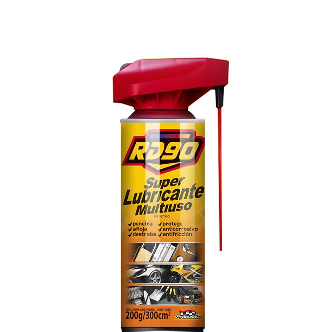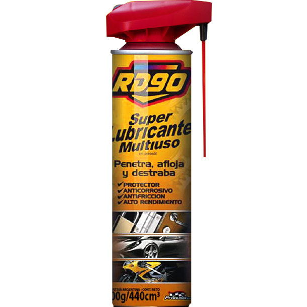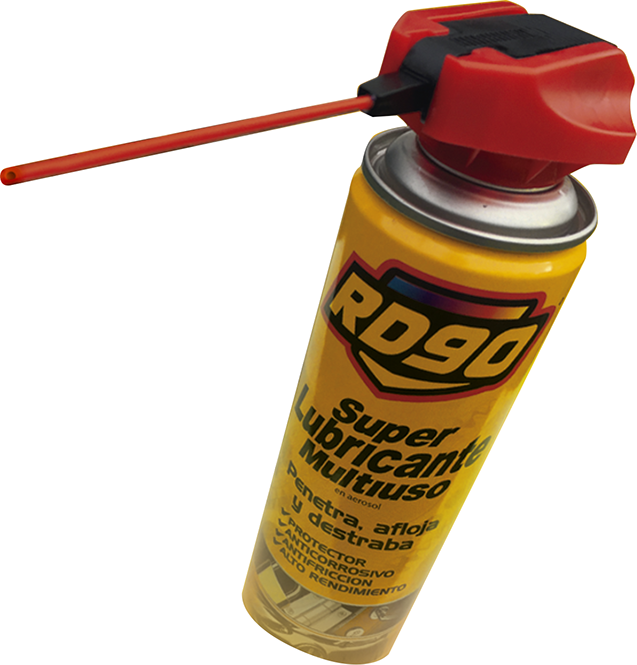 RD90 SUPER LUBRICANTE MULTIUSO CON ACTUADOR DÚO. Ultra rendimiento. Para aplicar en todo aquello que gire, friccione, roce, deslice o cruja y sobre mecanismos trabados por el óxido y la humedad. Ideal para recubrir y proteger grandes superficies. Remueve manchas y pegamento de calcomanías sobre cristales, parabrisas, etc.