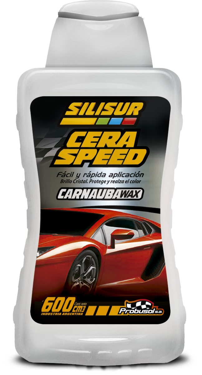 CERA SPEED CON CARNAUBA WAX Producto líquido de fácil y rápida aplicación. Brillo cristal y protección, es un producto para el cuidado del automóvil. Formulado de avanzada en base de ceras seleccionadas y siliconas, sin abrasivos y agradable fragancias. Protege y restituye el brillo original en todo tipo de pinturas: metálicas, bicapa, tricapa.